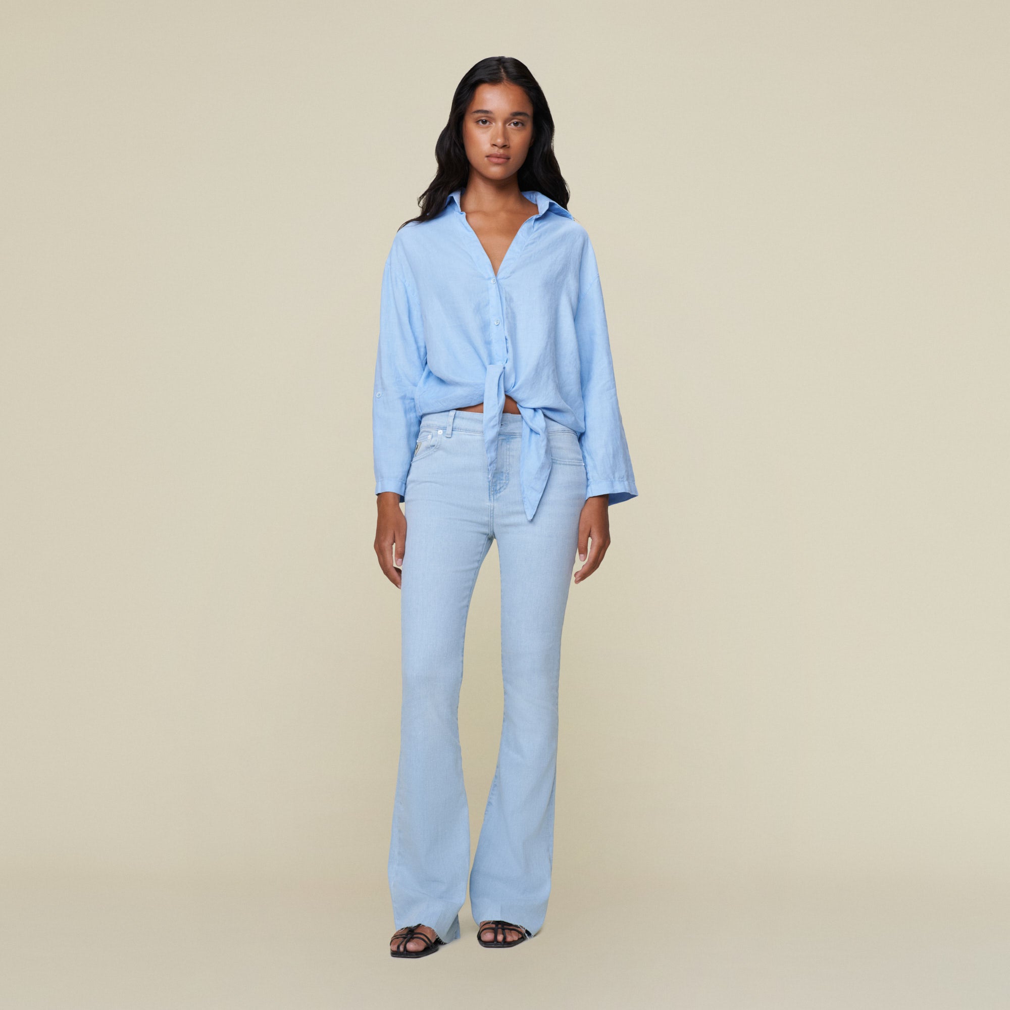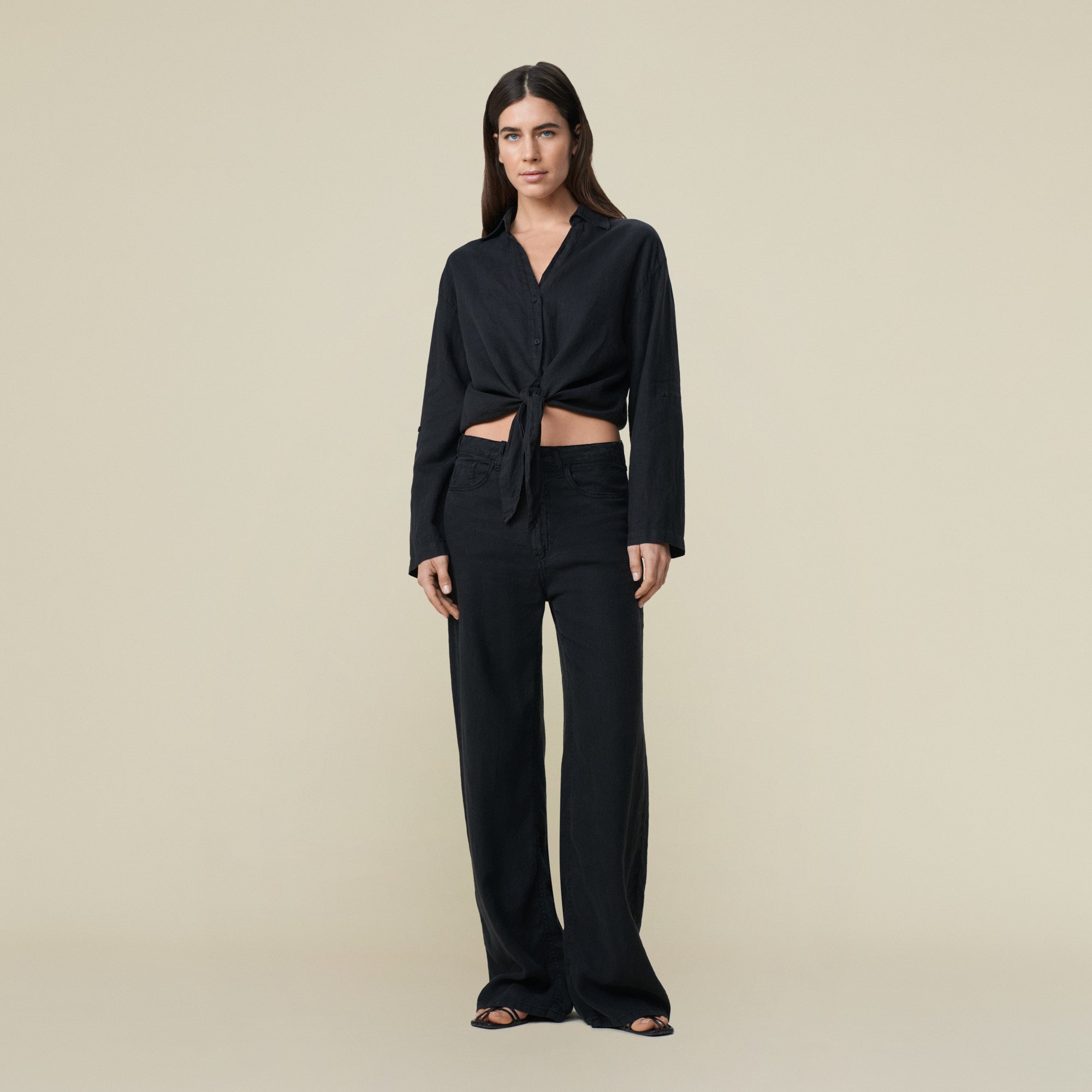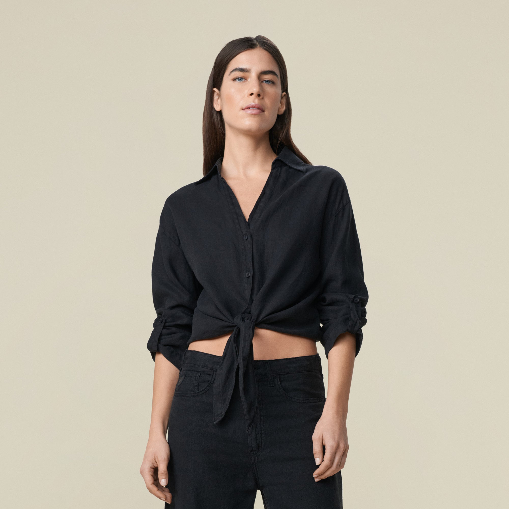 The Pia is our knotted shirt with button -tab sleeves.